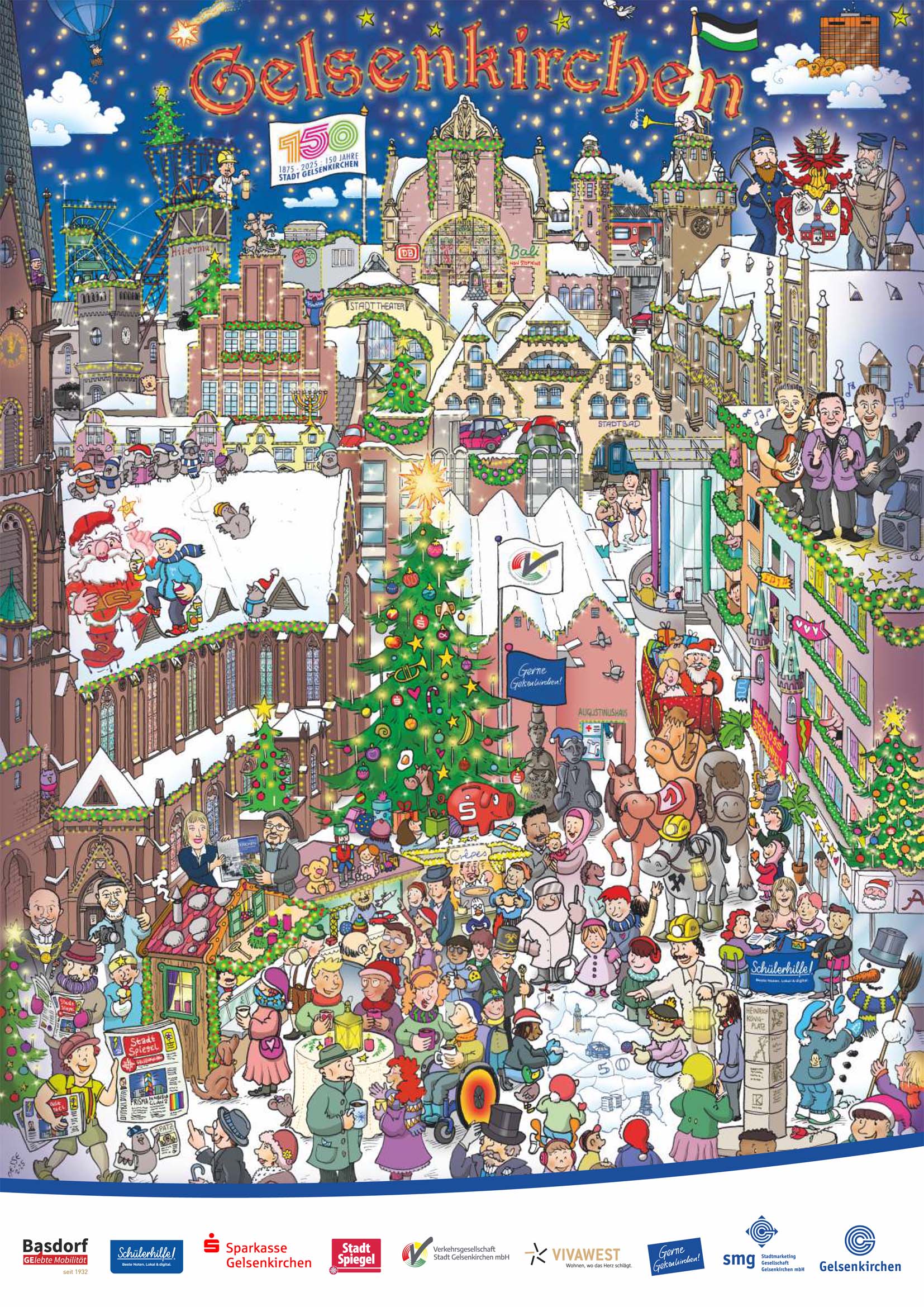 150 Jahre Gelsenkirchen wird nicht nur fröhlich das ganze Jahr 2025 in Gelsenkirchen gefeiert, sondern auch auf dem beliebten Gelsenkirchener Adventskalender, den die Stadtmarketing Gesellschaft Gelsenkirchen (SMG) bereits in der 11. Auflage erfolgreich herausgibt. Dieses Jahr zeigt das Motiv – im Jubiläumsjahr nicht überraschend – den weihnachtlich geschmückten Heinrich-König-Platz und die Ahstraße und damit die City von Gelsenkirchen. Überraschend präsentiert sich dagegen die Skyline. Passend zum 150-jährigen Stadtjubiläum erhebt sich hier nämlich das historische Gelsenkirchen, so zum Beispiel das alte Rathaus am Machensplatz, der alte Hauptbahnhof, die Zeche Hibernia, das Stadttheater sowie das Stadtbad an der Husemannstraße. Trubelig weihnachtlich geht es im Vordergrund auf dem Heinrich-König-Platz zu. Der Nikolaus verteilt mit seinem Pferdeschlitten, an dem natürlich ein Grubenpferd ein Rennpferd und ein Wildpferd in Gelsenkirchen nicht fehlen dürfen, die letzten Weihnachtsgeschenke. Kinder bauen fröhlich einen Schneemann sowie aus Schnee Gelsenkirchen nach und an den weihnachtlichen Ständen herrscht fröhliche Vorweihnachtsstimmung.